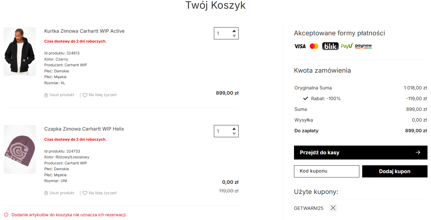 - Wybierz nieprzecenioną kurtkę zimową oraz czapkę zimową, a po wpisaniu kodu GETWARM25 cena czapki spadnie do zera!